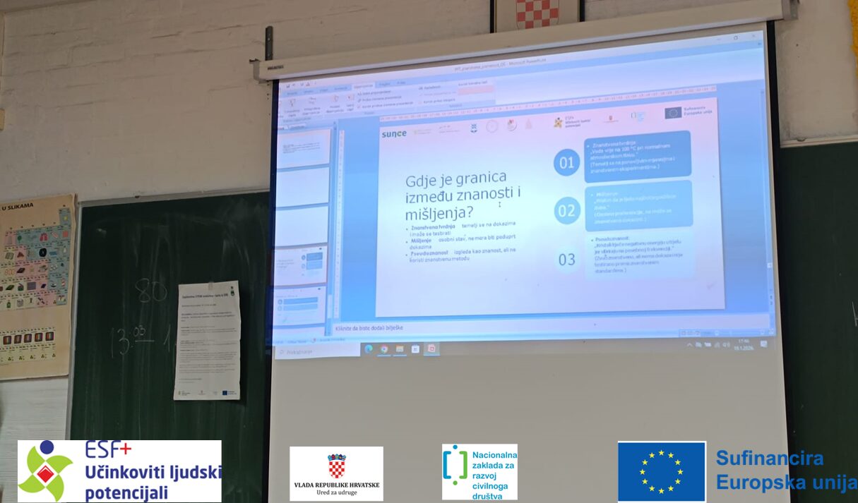 Učenici osmog razreda imali su priliku zaplovili su u svijet znanosti kroz zanimljive i interaktivne aktivnosti kojima su učili kako razmišljati poput znanstvenika – promatrati, postavljati pitanja, donositi zaključke i razlikovati činjenice od mišljenja. Kroz praktične aktivnosti i vođene diskusije učenici su učili kako prepoznati kvalitetne i pouzdane izvore informacija, analizirati podatke te donositi informirane odluke temeljene na znanstvenim dokazima.