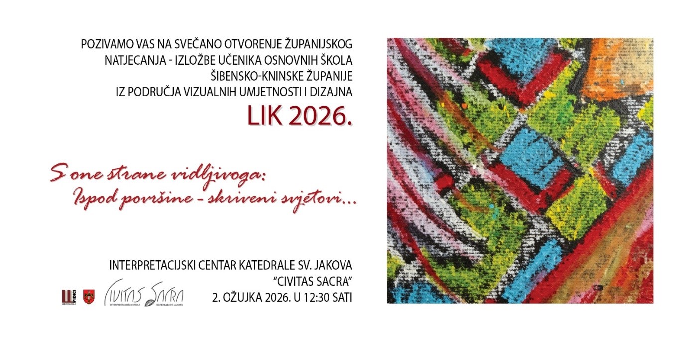 Županijsko Natjecanje/ izložba učenika osnovnih i srednjih škola iz područja vizualnih umjetnosti i dizajna – LIK 2026., održala se 2. ožujka 2026. godine u Šibeniku u galeriji Interpretacijskog centra „Civitas Sacra“ s početkom u 12:30 sati, na kojoj su izloženi svi likovni radovi koji su pristigli na županijsku razinu natjecanja.